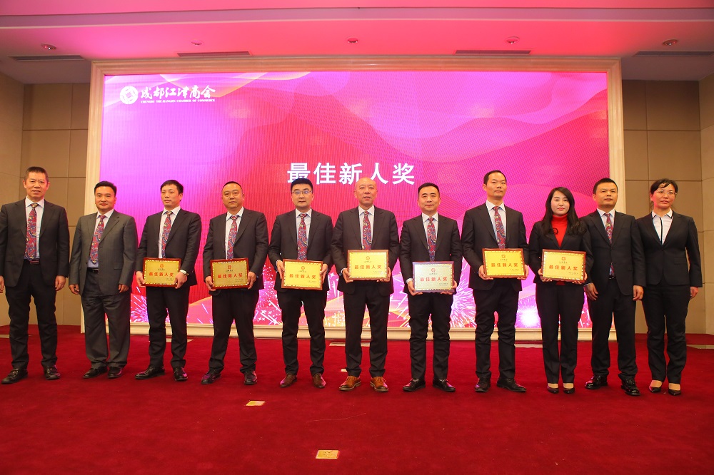 中共成都江津商会党委委员、成都江津商会监事长龚继周宣读新增理事、副会长、常务副会长决定,会长周跃飞为其颁发了牌匾;中共成都江津商会党委书记、副秘书长宋其才宣读表彰决定;庆典大会在颁发优秀会员奖、最佳新人奖、热心公益奖、最具奉献奖、卓越贡献奖中达到了高潮。中共四川省委组织部原副部长、四川省委老干部局原局长彭德秋,中共重庆市江津区委常委、统战部部长杨莉,重庆市江津区人民政府副区长杨永芳,巴中军分区原司令员李友贵,四川省新闻出版广电局原党组成员、纪检组长、监察专员曾祥明,省社保局副巡视员、原副局长李绍泉,中共重庆市江津区统战部副部长、区工商联党组书记李成刚,重庆市人民政府驻川办经联处处长王强,成都市工商联党组成员、副主席贺鹰,中共成都市委组织部三处处长李秀峰,中共成都市委统战部经济处处长刘佳,成都市民政局人事处处长刘川云分别把卓越贡献奖、最具奉献奖、热心公益奖颁发给了周跃飞、刘开文、罗树林、龚继周等获奖者。