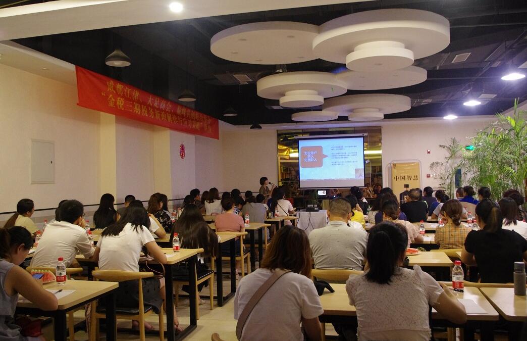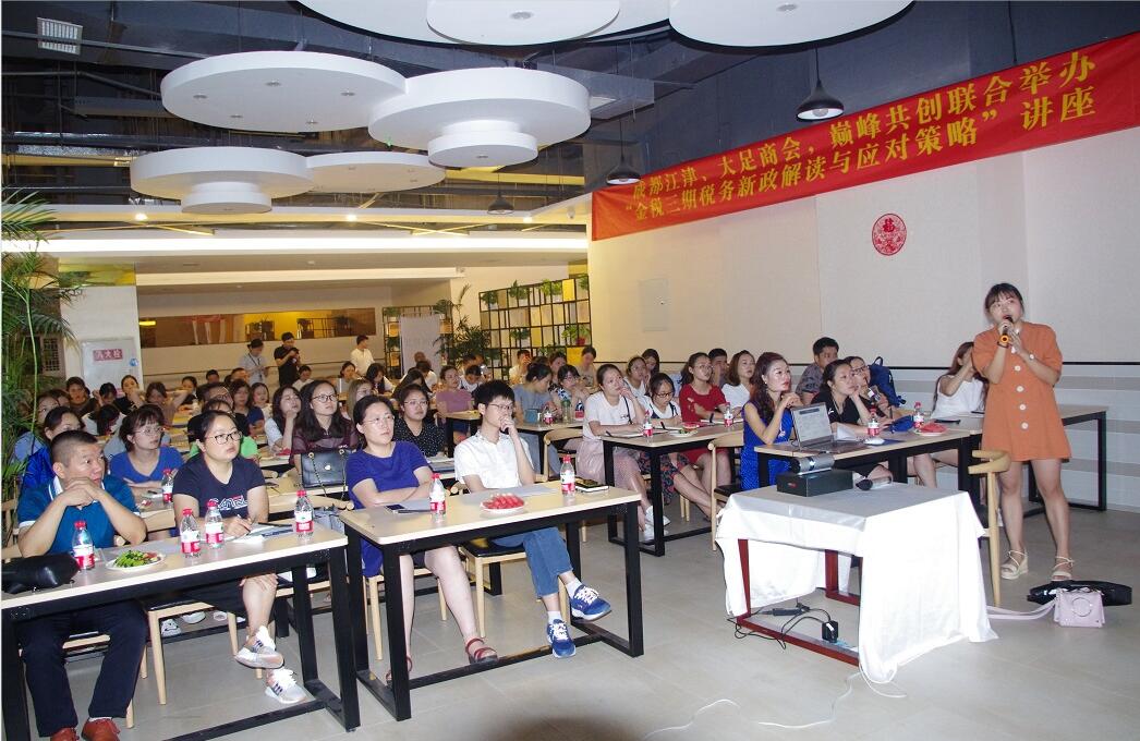 2019年8月15日下午2时,由成都江津商会、成都大足商会、巅峰共创联合组织的财税相关政策解读培训在位于高新区中航国际交流中心A座汇金源成功举行。来自各商会会员、企业家、财务负责人80余人受训。